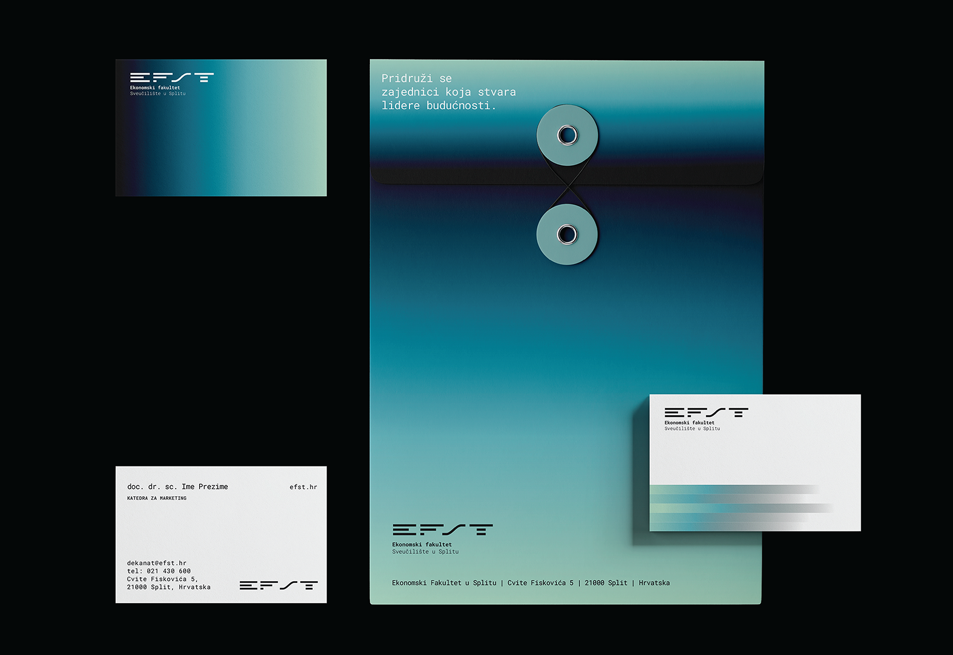 The visual identity for the Faculty of Economics and Business in Split is built around the concepts of analytics, growth, and contemporary academic values, with subtle references to the Mediterranean context. The system is designed to be clear, flexible, and functional across both digital and print media.